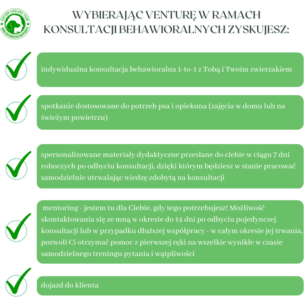 Po zakończonym spotkaniu wysyłam materiały z zagadnieniami i ćwiczeniami, które poruszyliśmy podczas wizyty. Plan pracy może podlegać modyfikacjom ze względu na zmianę zachowania psa.